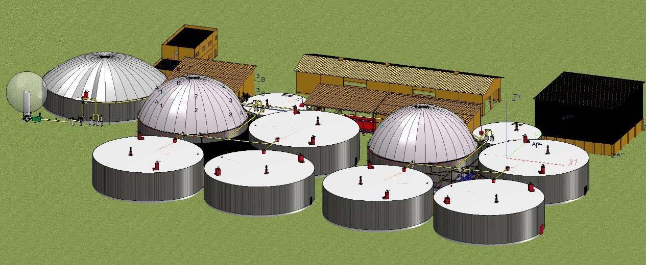 - 6 Fermenter mit je 3.880 m³ Volumen (Ø 26 m x 8 m)